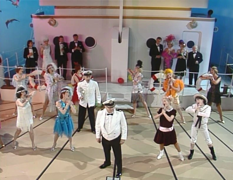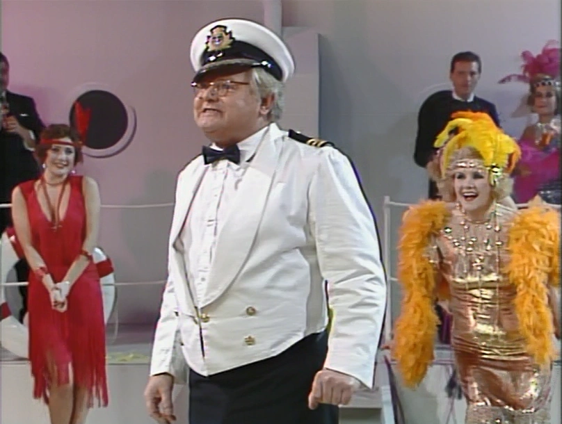 A Girl In Every Port was the opening number on March 12, 1986 featuring Benny Hill and incorporating songs into a sketch format set on a ship. It is possibly one of the largest musical numbers on the show along with Gangster Benny (AKA "It's A Hard Hard Life") with two crew men (Jon Jon Keefe and Bob Todd), nine passengers (Henry McGee, Mike Mulloy, Sue Upton, Louise English?, Len Keyes and four unknowns) and the Hill's Angels (Katie Randall, Tracy Smith, Claire Fairgood, Emma Bryant, Samantha Spencer-Lane, Alison Thomas, Lorraine Doyle, Fiona Baker and Faye Mertens). It is followed by the songs You Made Me Love You and an ode to Captain Benny.