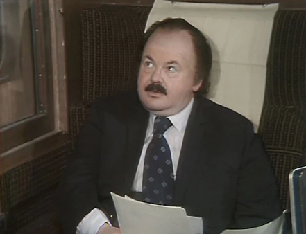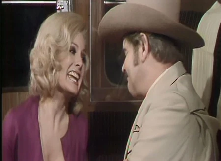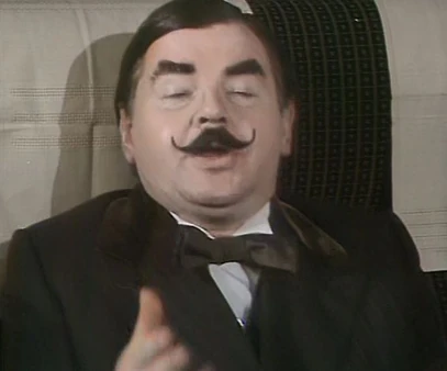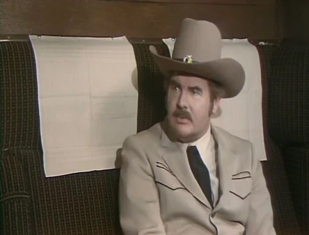 After Poirot talks a few minutes more, Cannon goes off to use the lavatory, but he gets stuck in the narrow corridor with Sgt. Pepper (Jenny Lee Wright); her cleavage in his face resulting in an embarrassing and unconscious turn of phrase, along with a few other off-the-cuff comments. In his absence, Ironside stops by the compartment and reminds McCloud about the murder and that he is the only one still on duty to investigate it, even as the train speed keeps rolling him back and forth through the train car. When McCloud stops the train to do an investigation, the sudden stop rolls Ironside straight into the lavatory and he returns with the toilet seat over his head.