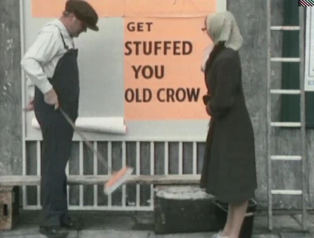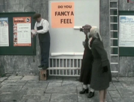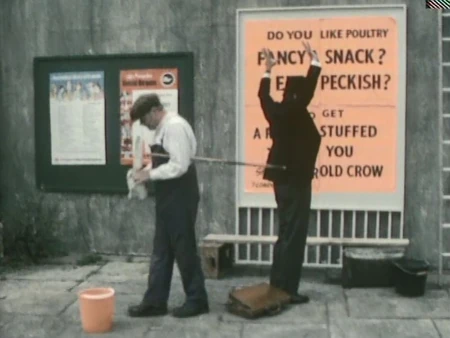 The Bill Poster is a British poster hanger in either Lower Tidmarsh or Little Dimpton. His real name isn't revealed, but he captures the attention of ladies offended by the partial message of a four-part ad ("do you fancy a feel") meant to lead customers to a butcher named Harold Crow. To make his job even harder, the third section of the signage when read separately from the rest turns out to read like an insult (calling one of the ladies "an old crow"). As he's wrapping up, he sticks his long-handled brush under his arm, the tip striking a gentleman (Henry McGee) in the back, who throws up his hands thinking he's being held up. When two police ladies appear, one of them gets jabbed by the tip as well and turns around swatting an innocent by-stander (Eddie Buchanan), who she thinks touched her.