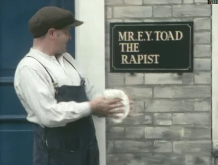 At another job, the Bill Poster installs a medical shingle for therapist E.Y. Toad (Jackie Wright). As the doctor comes out to inspect the work, he notices that "therapist" has been misspelled. The earlier by-stander arrives with two female officers (Libby Roberts and Teresa Lucas) and fixes his sign, later getting sprayed by the Bill Poster's soft drink from a can erupting all over him. The Bill Poster gets backed up to the sign for the butcher and steps on to a board supporting a bucket of plaster, causing it to fly up and land on the man's head. With the situation getting worse, the Bill Poster runs off getting chased by everyone on the street who he has annoyed into a nearby house and out of it.