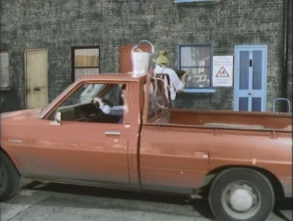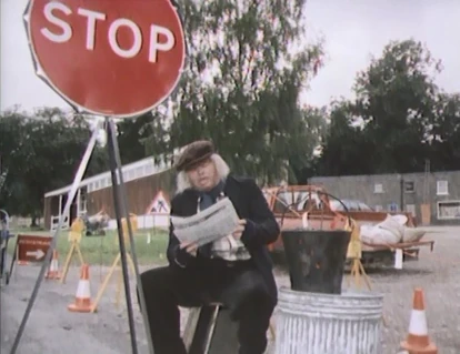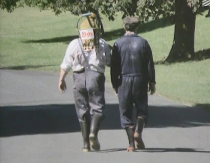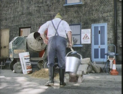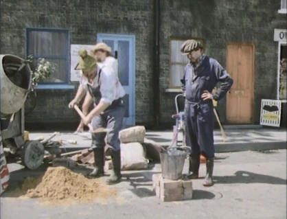 Down the way, the drunk stops at a construction site where two men (Benny Hill and Henry McGee) are working. After he knocks the bucket lose and goes on his way, one workman finds it and fills it with dirt, but he so distracted by pretty girls that he loses it, not aware its stuck to the end of his shovel. He eventually dislodges it on the roof of a pick-up that drops off a girl (Emma Bryant?), but he misses it.