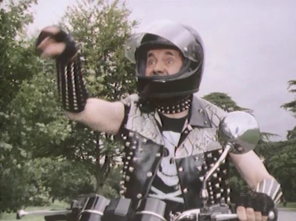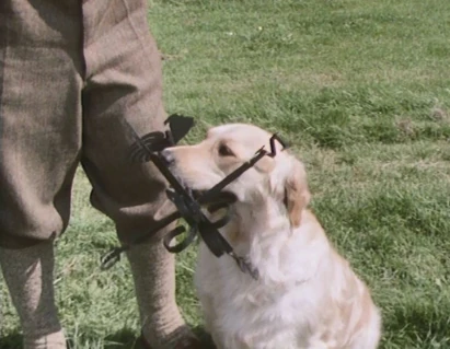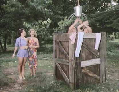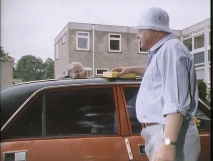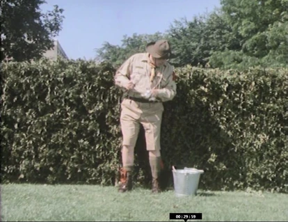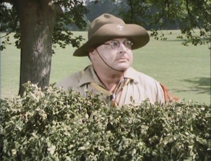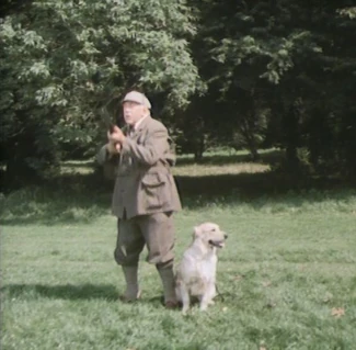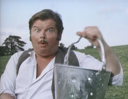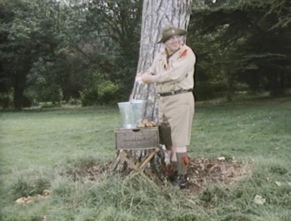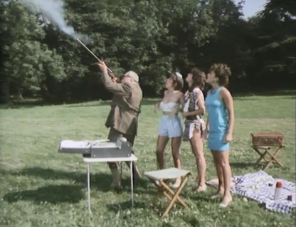 The pick-up drives on and comes to a sudden stop with a traffic officer (Henry McGee), who gets pummeled by the bucket flying off at him. He tosses it off a hedge where a boy scout (Benny Hill) finds it. Nearby in the reserve, a hunter (Bob Todd) is unsuccessfully trying to get his dog to retrieve. He becomes annoyed by three picnicking girls (Louise English, Fiona Baker and Faye Mertens) playing loud music. He goes up and fires their record as if it were a clay pigeon in to the air, shooting it into a million pieces. Looking around, the girls notice the scout peeling potatoes in the water-filled bucket obscured by the tree, but as the hunter's errant shots strike it, the holes in the hidden bucket make it look like he's reliving himself behind a tree. It's funny until his stream turns into two streams.