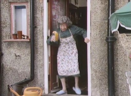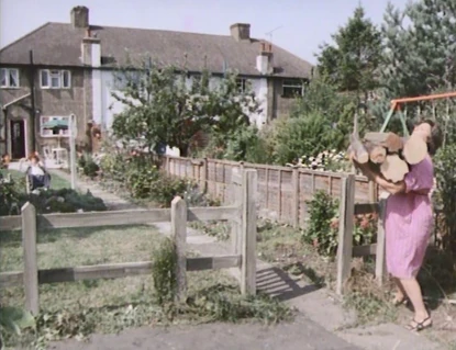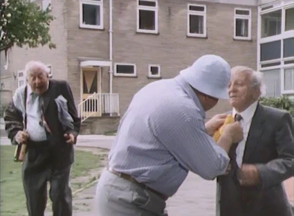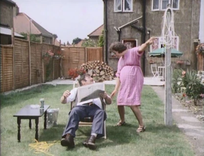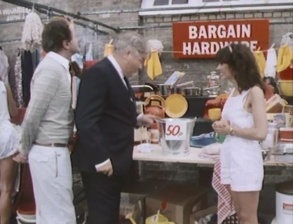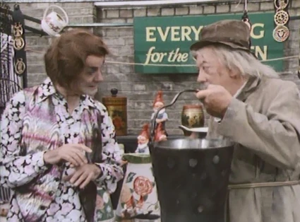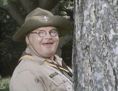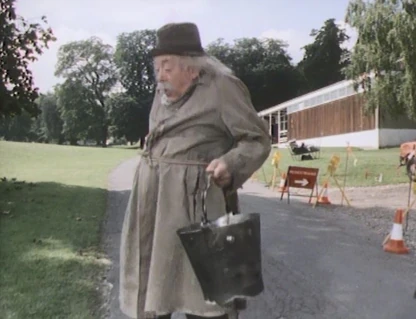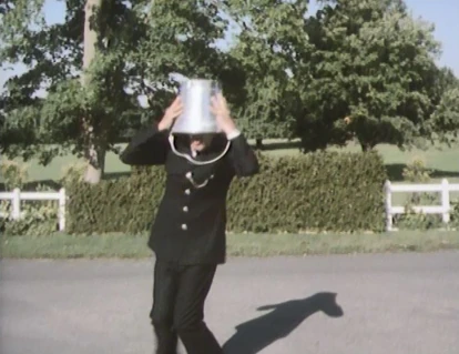 Frightened by the shots, the scout accidentally knocks the bucket off its stand, and it rolls into a campsite where a camper (Jon Jon Keefe) finds it and pokes more holes in it so he and a friend (unidentified) can turn it into a shower and wash themselves. When the scout goes looking for his lost bucket, he knocks it out of the tree the campers placed it with a sling shot, sending it flying over a hill where a dark-haired man with a mustache (Benny Hill) finds it and takes it home. He's so lazy that he uses a rope to open the gate for his pregnant wife (Faye Mertens?) to carry coal as his mother (Sydney Arnold) dotes on him with drinks. After his wife leaves the bucket of coal outside the gate, a vagrant (Benny Hill) uses the bucket of coal to stay warm near a stop sign near at a construction site. After an annoyed motorcyclist (Henry McGee) knocks his bench over, a bum (Bob Todd) collects the bucket and sells it back to the Flea Market where a female artist (Henry McGee) paints a design on it and sells it back to the original owner for 19.99. Taking it home, his wife recognizes it through the distinctive bend in the handle, but she gets quickly distracted again and the bucket once again gets caught on the shovel handle of the workman again.