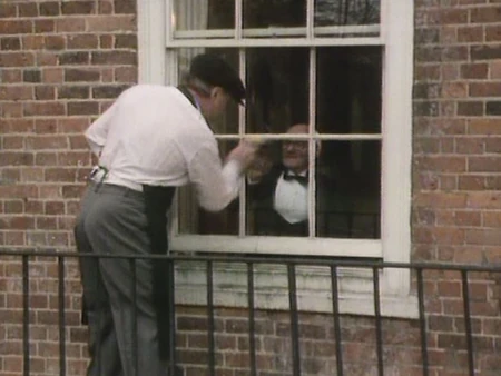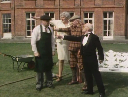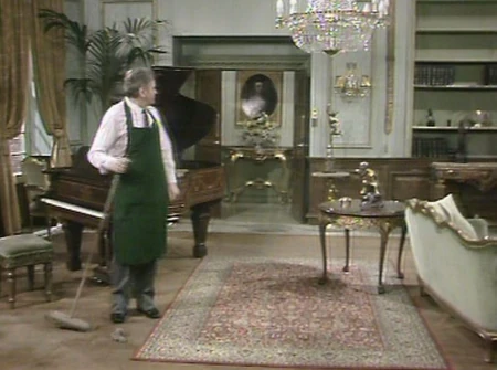 When the house places an ad in the local village for a man to work around the house, a position combining the roles of servant and groundskeeper, a local man (Benny Hill) shows up at the house applying for the job. On arrival, he borrows a flower from the bush out from as his boutonniere. When he rings the door bell, he looks away and accidentally tries ringing the butler's face when he arrives. Inside the house, the daughter takes a shine to him as he is hired and starts work. cleaning the parlor, he tries sweeping the dust under the rug, but the butler has a note there ahead of time to stop him. In his capacity as a groundskeeper, he accidentally douses the butler with the hose after turning the water on and tracks mud through the house as he rushes to answer the telephone, during which time he tries sampling the owner's wine. When the butler shows up to take the phone call, he ends up pouring wine in his ear from the glass mistaken as an earpiece.
