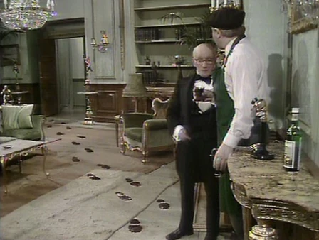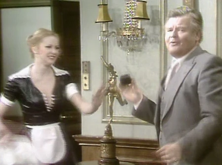The new man is also given the task to train his employer's dog as a retriever, but he can only get it to fetch sticks. The daughter is still flirting with him, causing him to spray cleaner into the face of the butler when he gets distracted at cleaning windows. When he acts as a bartender at a party, he ends up enchanting several female guests, even getting tipped after making sure a coat properly fits one guest (Roger Finch), but when the butler tries the same trick on a female guest (Samantha Spencer-Lane ), he gets slapped.